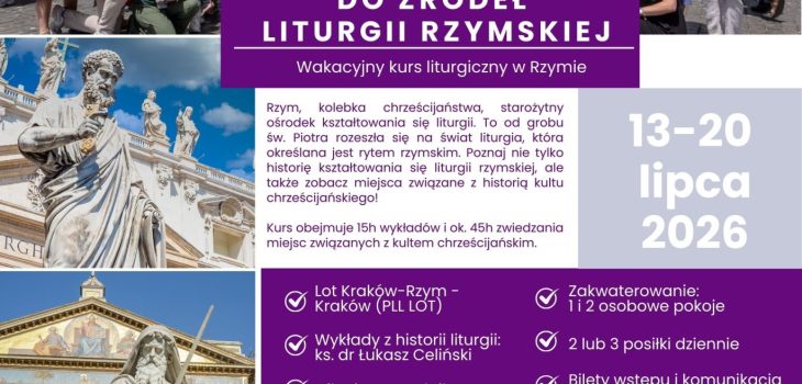 Tydzień w sercu chrześcijaństwa, w miejscach, gdzie rodziła się liturgia Kościoła. Zapraszamy na czwartą edycję wakacyjnego kursu liturgicznego w Rzymie – spotkanie z historią, teologią i żywą tradycją rytu rzymskiego. Rzym – kolebka chrześcijaństwa i starożytny ośrodek kształtowania się liturgii. To od grobu św. Piotra, na terenie dzisiejszego Watykan, rozeszła się na świat liturgia określana … Czytaj dalej Wakacyjny kurs liturgiczny „Do źródeł liturgii rzymskiej” w Rzymie.